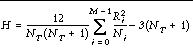 where N i is the number of observations in the i th sample population, N T is the total number of observations in all sample populations, and R i is the overall rank sum of the i th sample population.