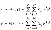 where g [ x , y ] represents the pixel in the output image at coordinate ( x , y ), and f [ x ', y '] is the pixel at ( x ', y ') in the input image that is used to derive g [ x , y ]. The functions a ( x , y ) and b ( x , y ) are polynomials in x and y of degree N , whose coefficients are given by P and Q , and specify the spatial transformation: