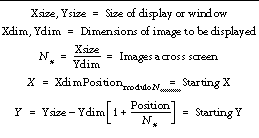 An integer specifying the position for Image within the graphics window. Image positions run from the top left of the screen to the bottom right. If a position number is used instead of X and Y , the position of the image is calculated from the dimensions of the image as follows (integer arithmetic is used):